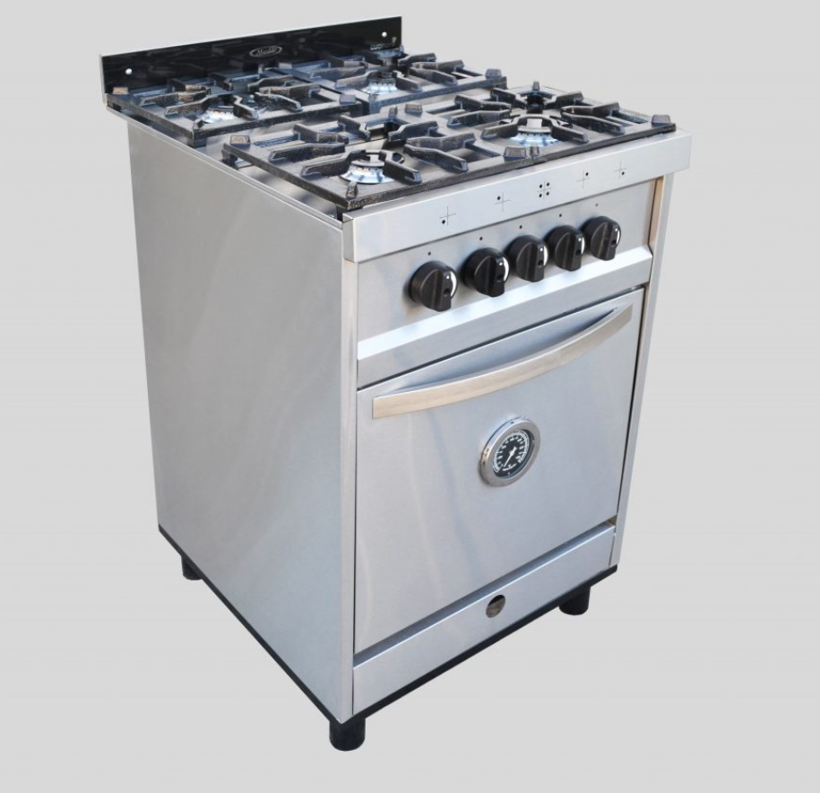 Tres medidas de ancho: 50, 55 y 60 cm. Alto 86cm. Prof. 62cm. Peso aprox. 45 Kg. Construida en Acero inoxidable. Equipado con válvulas de seguridad en horno, que en caso de ausencia de llama corta el paso del gas en el mismo